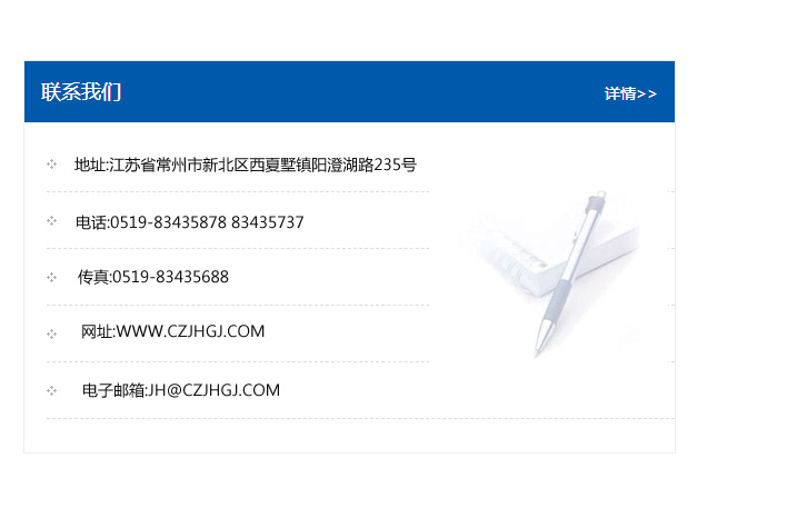地址:常州市新北區友邦商務大廈1幢16、17層  電話:0519-85101652  傳真:0519-85112595  郵編:213022  網址:www.cz-jiayue_cn.longbang024.com  郵箱:xiajifengaa@163.com